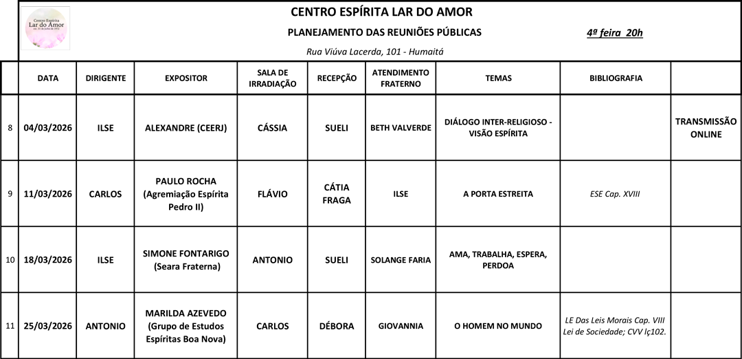 Uma ou duas vezes ao mês, as palestras são transmitidas ao vivo pelo nosso canal do YouTube: https://youtube.com/channel/UCx5mFOSLAKhkR1zn3l3o9Hw. Siga o Lar do Amor no Instagram ou no Facebook para acompanhar nossa programação.